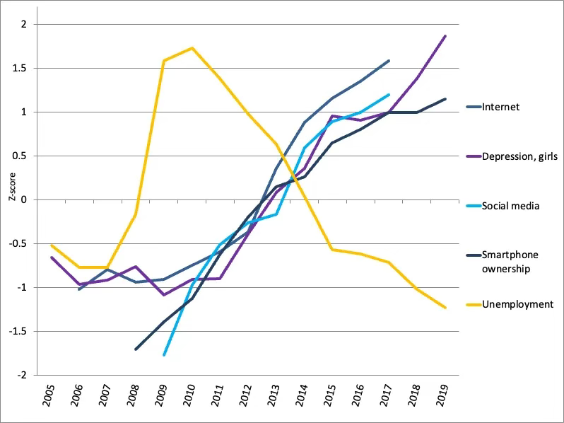 ’s most excellent blog, Generation Tech, in a piece entitled “Here are 13 other explanations for the adolescent mental health crisis. None of them work”. If you’re not familiar with Jean’s work, she is one of the leading proponents of the psychological community’s clarion call to parents to stop providing their children with unfettered access to smartphones and social media, speaking, rightly, to their declining mental health as a corollary to the declining cognitive aptitude outlined above. She works regularly with and I’d strongly recommend anyone interested in taking a look at both of their blogs (Jonathan’s After Babel is a must)The purple line points to depression in girls, the light blue is the adoption of social media, and the dark grey, proliferation of internet and smartphone ownership. It is in the same period - the 2012 bracket - in which we see a rapid upsurge in both mental health issues, and in the decline in our academic potential. Something to consider.