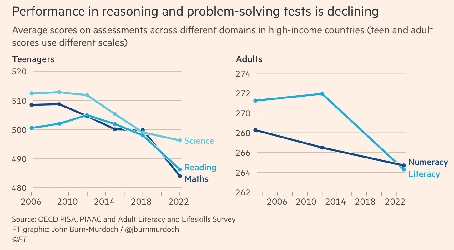 The clearest sign of this shift can be found in global education and skills assessments. The OECD’s PISA tests, which track 15-year-old students’ reading, maths, and science performance worldwide, show that scores peaked in 2012—and have been falling ever since. Depressingly, similar traits can be seen with adults, as the below charts present from John’s FT article, pointing to a significant drop in problem-solving and reasoning ability across all age groups.