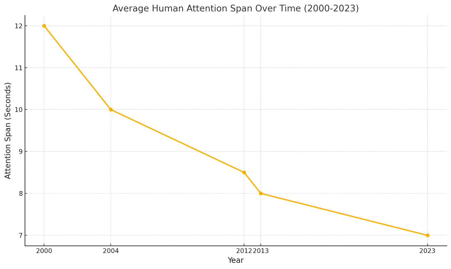Now I will get shouted at for the above because, yes, how one defines “attention span”, who you use in your sample set and, indeed, how you measure as nebulous a concept as attention is going to make this a problematic chart to say the least. Most of you would have heard the charge that we’re now teetering on the edge of having the same concentration span as a goldfish (we’re now at 7 seconds, and a goldfish apparently can master a whole 8…even though I’m unsure how they measure a goldfish’s attention…there isn’t that much for them to observe or remain focussed on in their bowls…could they just be bored?). But whatever way you look at it, just as I do with the rise in mental health problems in our young people that suspiciously correlates to the massive upswing in both digital proliferation and social media adoption, you can infer that the trajectory isn’t what it should be even if you are to dispute the causation.