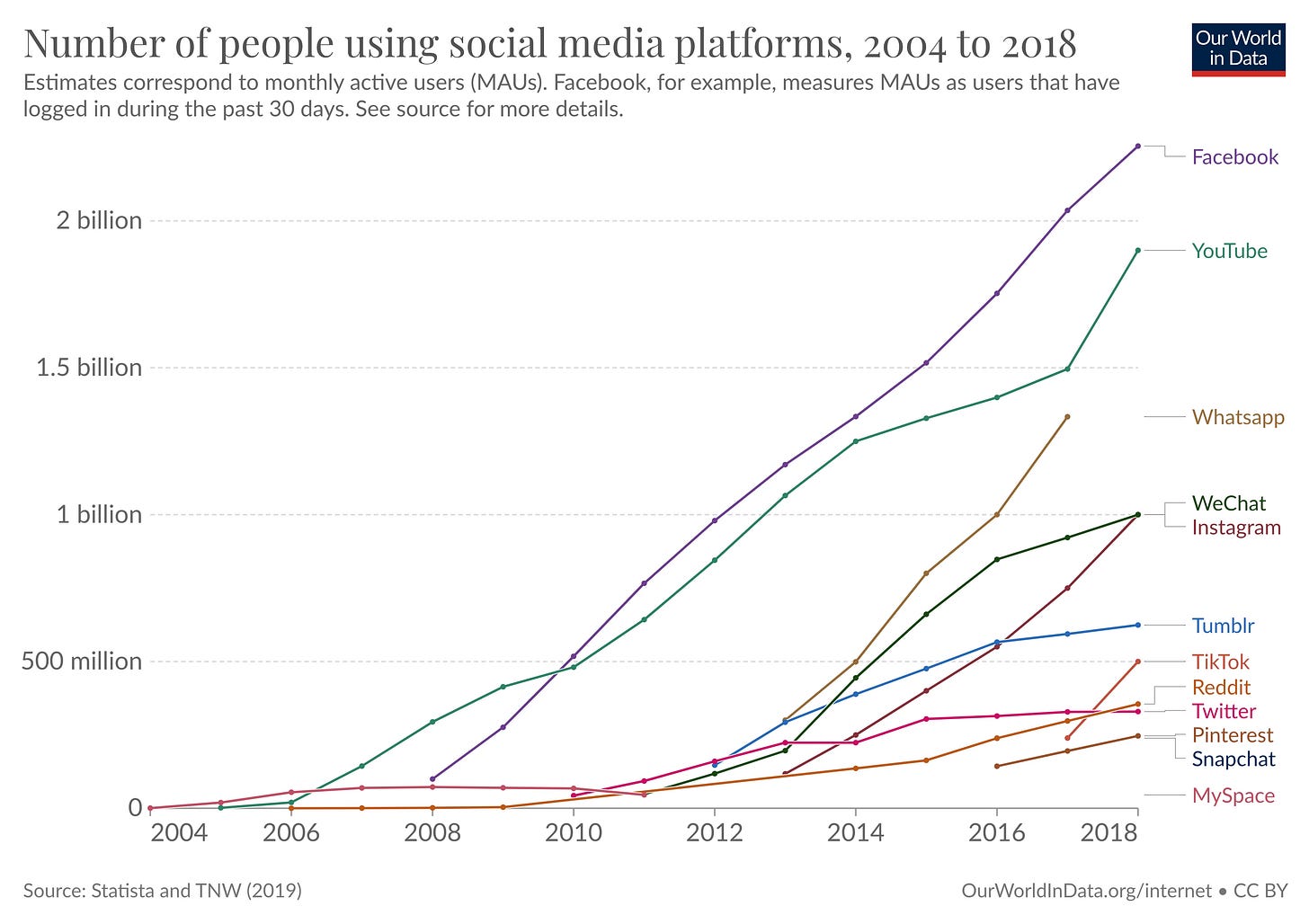 What’s changed? Well clearly now things are exponentially faster and you can now access whatever you want, whenever you want, direct from the phone in your pocket (iPhones were not, I think, released until after my sad and sorry days in University, where we no doubt suffered miserably socially disconnected existences without that instantaneous digital connection available to us all of the time. ). And, social media changed the landscape from information transfer, to social connection, and then entertainment (read news and any form of content). The below chart from the World in Data is a bit out of date now, but should evidence the explosion in social media adoption over the period in question